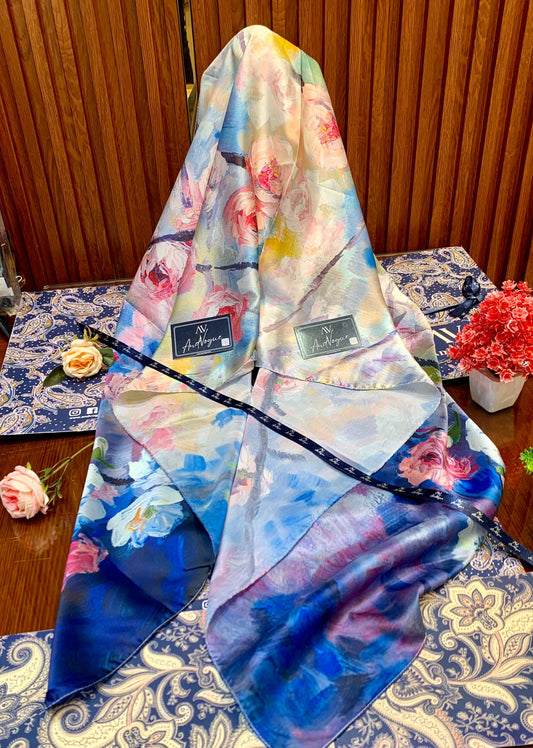 Blue Pretty Collection- Trending Floral Printed Silk Scarves & Stoles Wrap