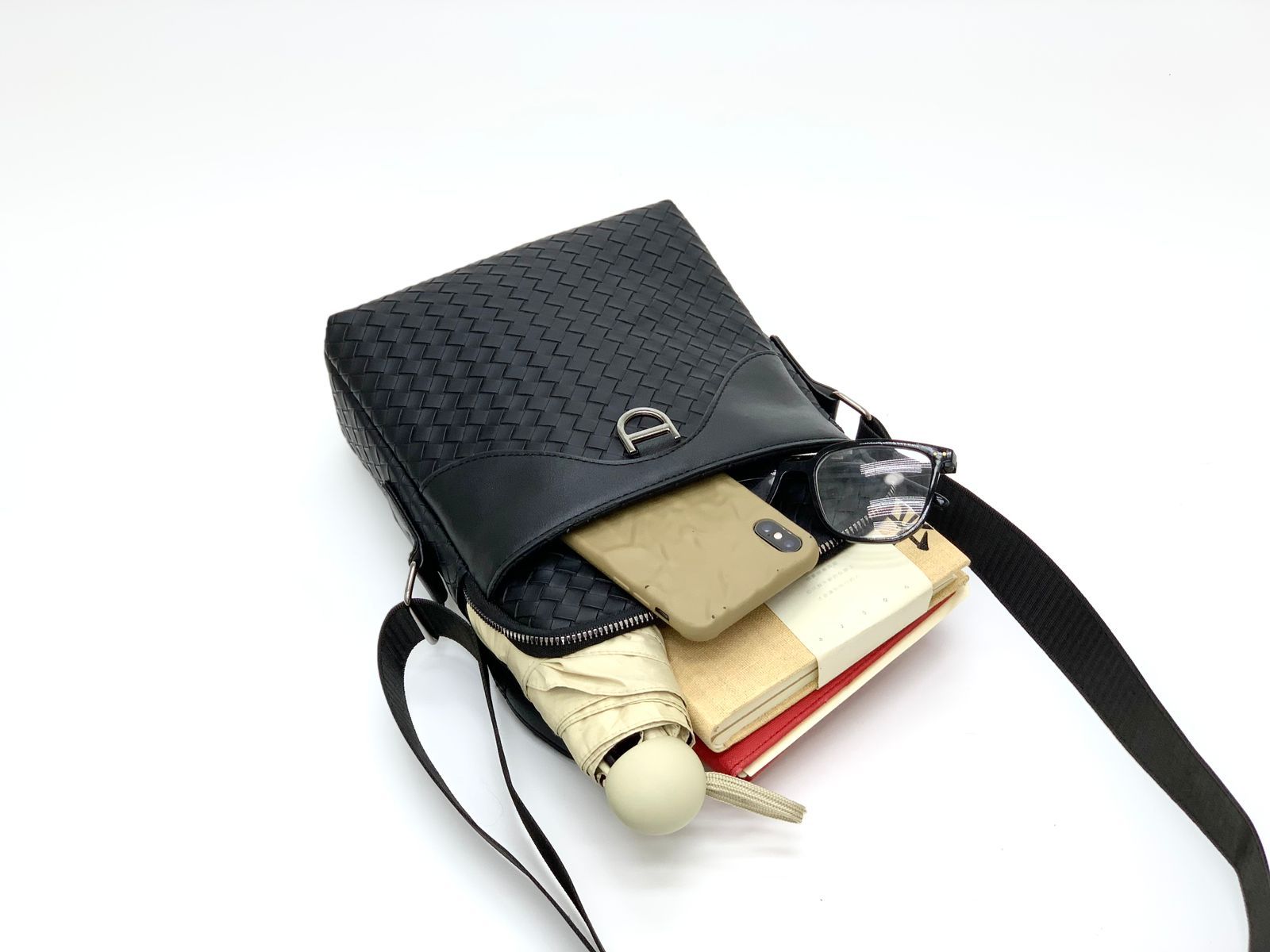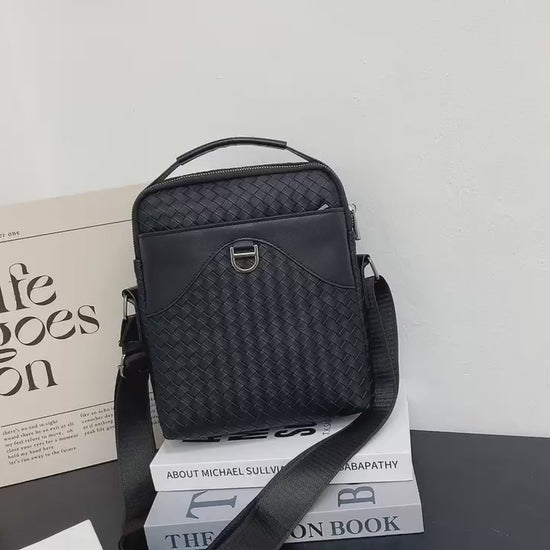 This sophisticated black messenger bag is a must-have for anyone who wants a stylish and practical bag for everyday use. Crafted from woven leather, this bag features a sleek, structured design that adds a touch of polish to any outfit.