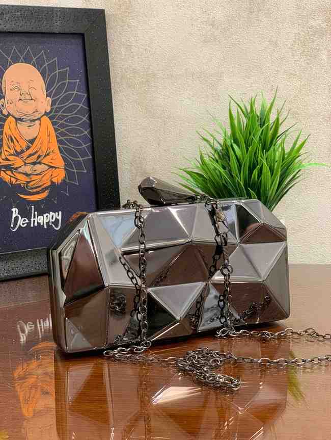 Stone cut evening bag clutch purse alloy metal hard case clutch is a stunning addition to any look. The clutch is styled to look like an abstract cut stone or gem. The small inner compartment is roomy enough to hold your essentials for a night. Also comes with a removable chain to transition this party clutch into a shoulder or crossbody bag. Simple, vintage, noble style, evening bag for the wedding party, prom, cocktail, fashion show, ceremony, shopping, dinner, perfect accessory for any night out